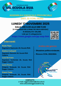 ASSEMBLEA SINDACALE PROVINCIALE IN SERVIZIO DA PARTE DELLA FEDERAZIONE UIL SCUOLA RUA CITTA’ METROPOLITANA DI REGGIO CALABRIA PER IL 17/11/2025 IN ORARIO DI SERVIZIO DA SVOLGERSI IN MODALITA’ ONLINE PER TUTTO IL PERSONALE DELLA SCUOLA